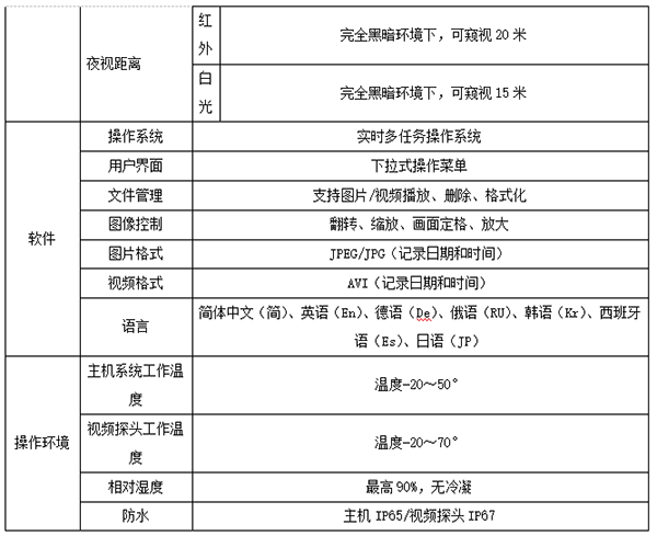 2)可見光攝像頭用于觀察內部裂紋、銹蝕、異物等。廣泛應用于航空、汽車、船舶、電氣、化學、電力等現代核心工業生產、檢修等多個環節。采用高亮光纖照明技術,發射5000K可見光源,照度可達60000Lux以上;