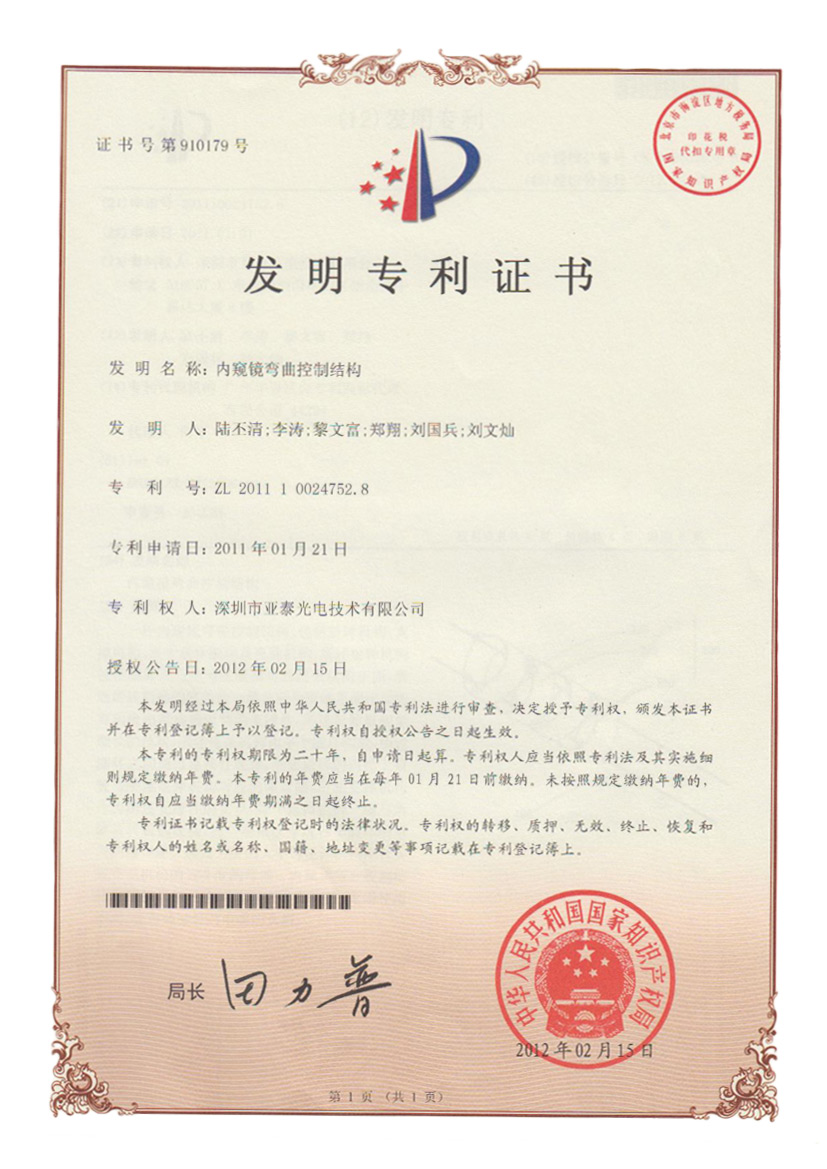 亞泰光電首頁 >> 走進(jìn)亞泰 >> 亞泰光電資質(zhì)榮譽(yù) >> 發(fā)明專利 >> 內(nèi)窺鏡彎曲控制結(jié)構(gòu)