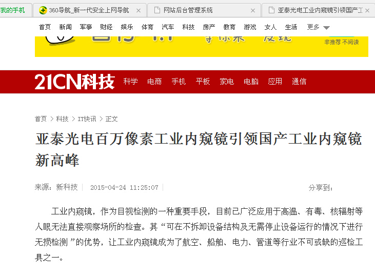 為改變這種局面,作為“國家高新技術(shù)企業(yè)”的深圳市亞泰光電技術(shù)有限公司,自2009年開始著手對(duì)工業(yè)內(nèi)窺鏡的研發(fā)工作,成立了光學(xué)事業(yè)部并特別聘請(qǐng)了深圳大學(xué)牛憨笨院士作為技術(shù)顧問,經(jīng)過不懈的專研與努力,亞泰光電公司不僅擁有了自己的工業(yè)內(nèi)窺鏡產(chǎn)品,并先后獲得了5項(xiàng)工業(yè)內(nèi)窺鏡方面的發(fā)明專利。近日,由亞泰光電自主研發(fā)的“百萬級(jí)像素”的超清視頻內(nèi)窺鏡已成功問世,選用國產(chǎn)自主研發(fā)高端產(chǎn)品不再是夢(mèng)。
