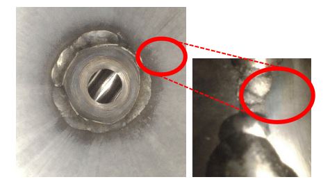 圖片:2.8 毫米雙視圖視頻內(nèi)窺鏡位于 ?” 內(nèi)徑燃油歧管管道內(nèi)。左圖顯示針對目標(biāo)軌道焊縫的前向視圖 (DOV)。右圖顯示針對焊縫的側(cè)向 DOV。這顯示了可能存在問題的不一致焊道。