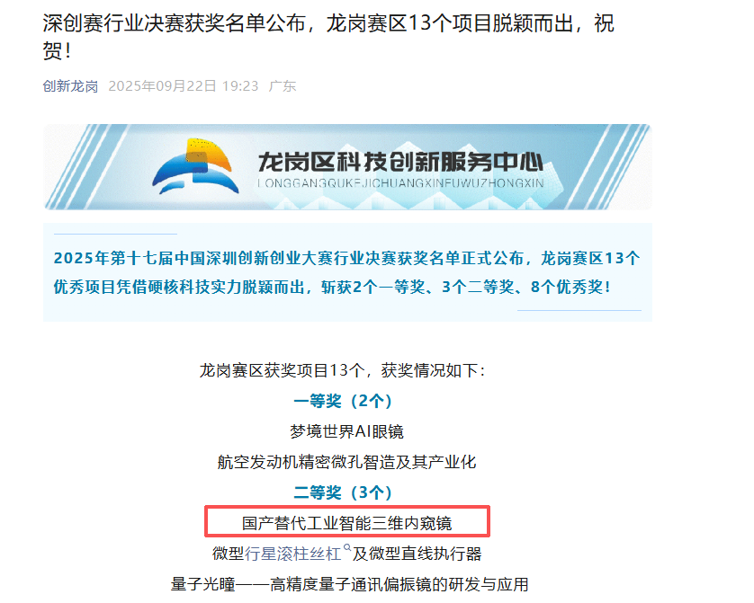 這一榮譽來之不易。就在9月22日,亞泰光電的“國產(chǎn)替代工業(yè)智能三維內(nèi)窺鏡”項目剛在深創(chuàng)賽中斬獲亞軍,順利拿到了進軍全國賽的“入場券”。此次在全國賽中再度獲獎,實現(xiàn)了從地方到國家的技術(shù)實力認(rèn)證雙跨越。