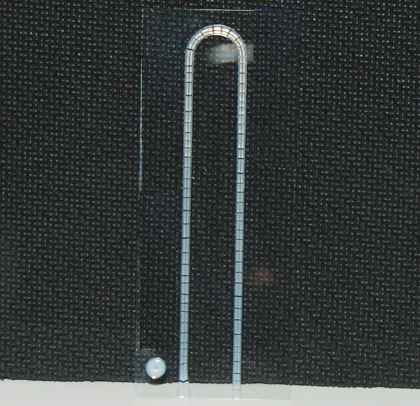 鐵譜片,分析式鐵譜儀耗材,用于油品定性分析——鐵譜分析制譜用。油樣經(jīng)虹吸泵引導(dǎo)流入鐵譜片,在高梯度磁場作用下,油品中的鐵磁性顆粒會按照規(guī)律排布于鐵譜片的U型槽內(nèi)。